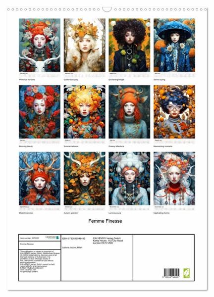 QUALITY - High-quality photo calendar with 12 beautiful images on light-resistant paper, robust spiral binding with hanger.SUSTAINABLE - Significant waste reduction due to print-on-demand production, environmentally friendly FSC-certified paper, produced in the UK, climate-conscious logistical processes.PERFECT GIFT - calendars for friends and family, for children, all ages and all occasions, from Christmas to birthdays and everything in between.LOTS OF CHOICE - Wall calendars in different sizes (DIN A4 and DIN A3), for anytopic and personal taste, featuring photography, painting and illustrations.Discover the captivating allure of Femme Finesse calendar, where the timeless beauty of women harmoniously intertwines with the essence of each season., author: JBJart