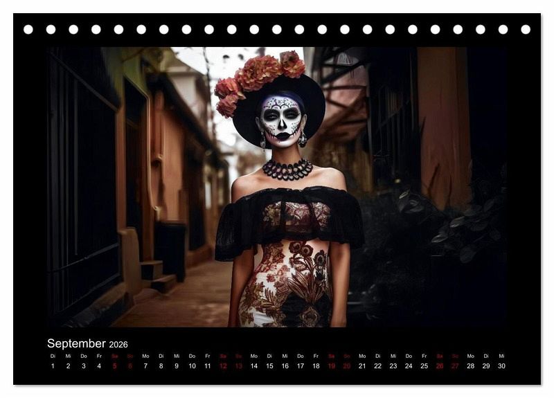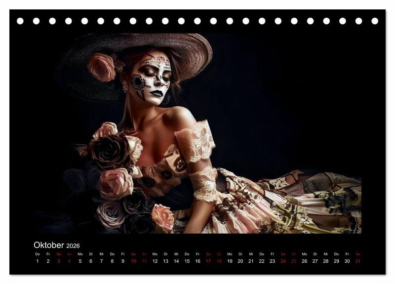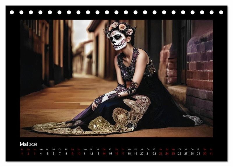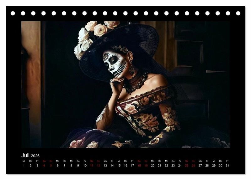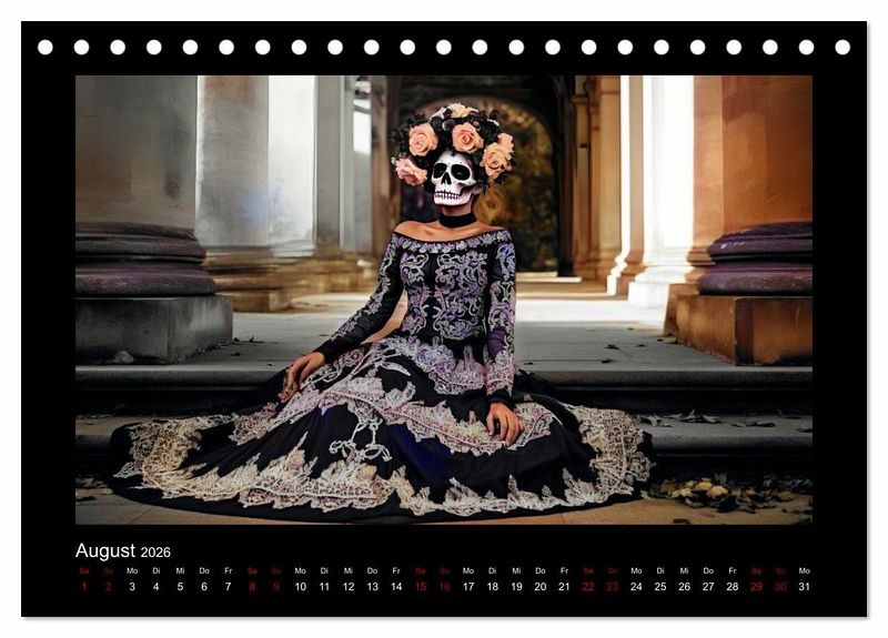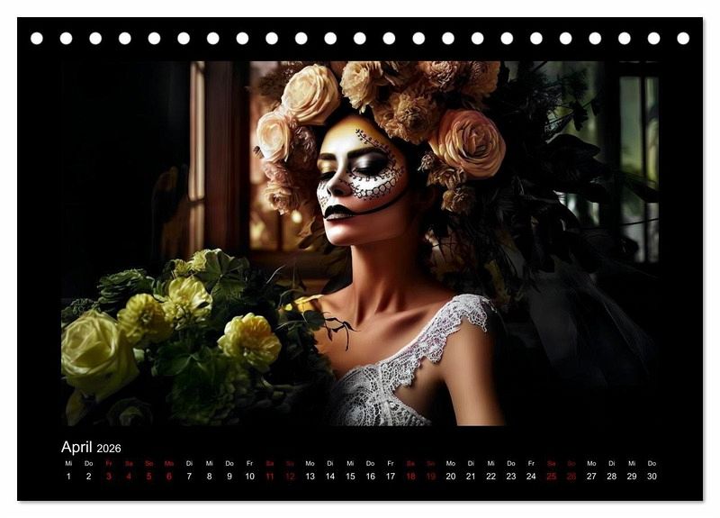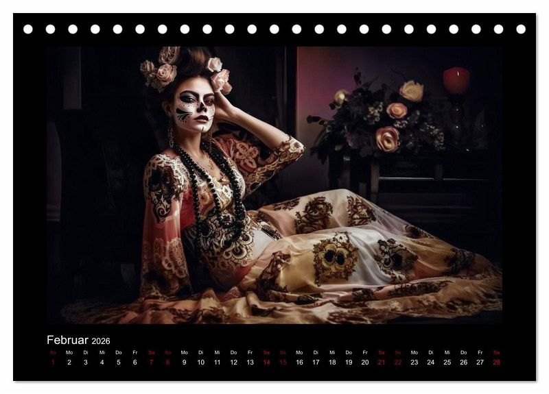 Willkommen zum Dia de Los Muertos-Kalender mit atemberaubenden Porträts von Frauen in traditionellen Kleidern. Dieser Kalender ist eine Hommage an die mexikanische Kultur und ihrer einzigartigen Tradition, die jedes Jahr am 2. November gefeiert wird. Die wunderschönen Porträts in diesem KI-generierte Kalender zeigen Frauen in authentischen Kleidern, die von den ausgefallene Designs und Mustern des Dia de Los Muertos inspiriert sind.