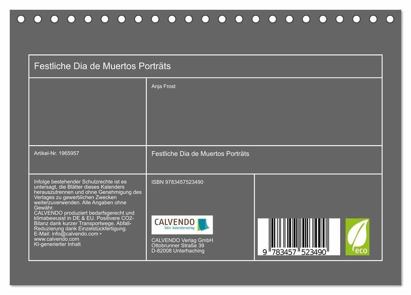 QUALITÄT - Hochwertiger Fotokalender mit 12 wunderschönen Motiven auf lichtbeständigem Bilderdruckpapier, robuste Spiralbindung.NACHHALTIG - deutliche Abfallreduzierung durch bedarfsgerechte Einzelstückfertigung, umweltfreundliches FSC-zertifiziertes Papier, Produktion in Deutschland, klimabewusste Logistik.PERFEKTES GESCHENK - Kalender für Freunde und Familie, für Kinder und Erwachsene, jung und alt, zu Weihnachten, Geburtstag oder zwischendurch.VIELFALT - Bildkalender in verschiedenen Formaten, z.B. DIN A5, DIN A4, DIN A3 sowie DIN A2. Ob Naturmotiv, Gemälde oder Fotos, ideal für ein persönliches Wohlfühlambiente.Das Fest des Lebens - Frauenporträt in Kleidern und verzierten Totenkopfmasken für den Dia de Los Muertos von Autor(in): Anja Frost