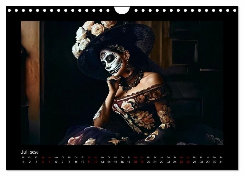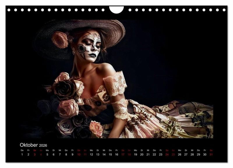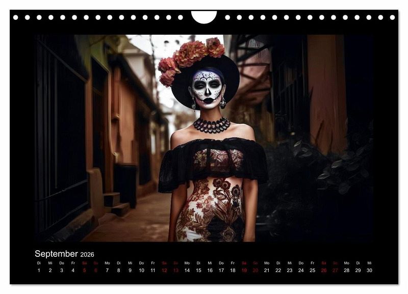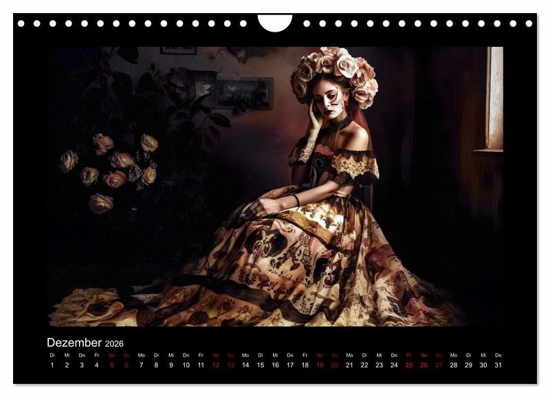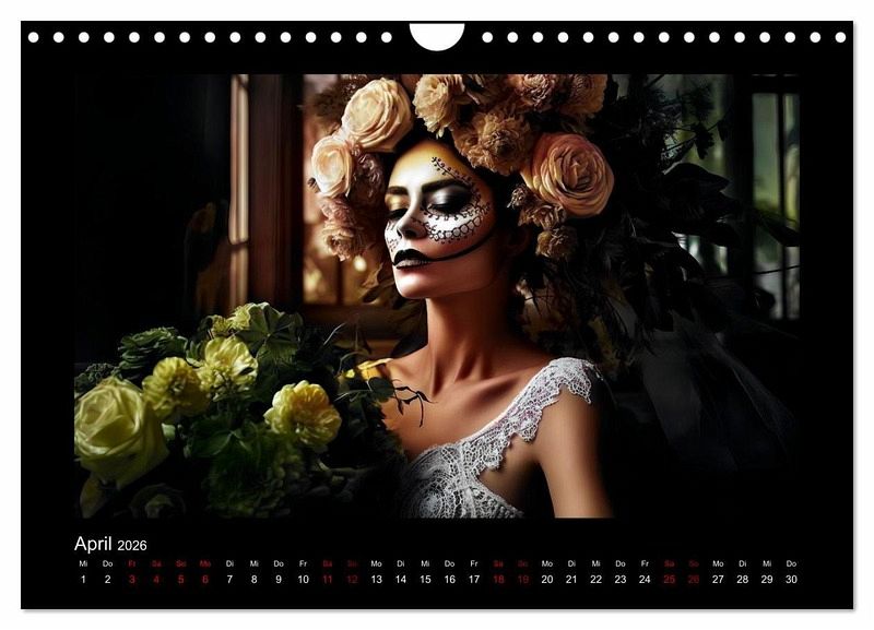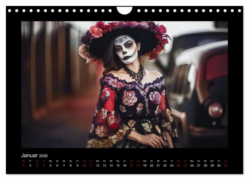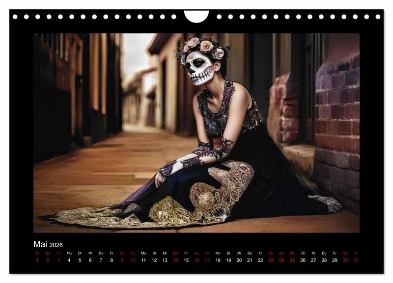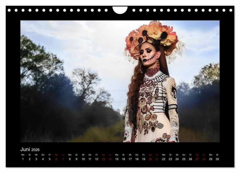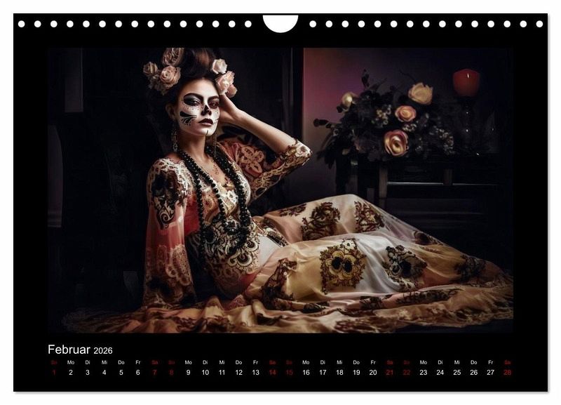 Willkommen zum Dia de Los Muertos-Kalender mit atemberaubenden Porträts von Frauen in traditionellen Kleidern. Dieser Kalender ist eine Hommage an die mexikanische Kultur und ihrer einzigartigen Tradition, die jedes Jahr am 2. November gefeiert wird. Die wunderschönen Porträts in diesem KI-generierte Kalender zeigen Frauen in authentischen Kleidern, die von den ausgefallene Designs und Mustern des Dia de Los Muertos inspiriert sind.