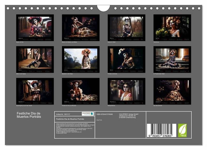 QUALITÄT - Hochwertiger Fotokalender mit 12 wunderschönen Motiven auf lichtbeständigem Bilderdruckpapier, robuste Spiralbindung mit Aufhängebügel.NACHHALTIG - deutliche Abfallreduzierung durch bedarfsgerechte Einzelstückfertigung, umweltfreundliches FSC-zertifiziertes Papier, Produktion in Deutschland, klimabewusste Logistik.PERFEKTES GESCHENK - Kalender für Freunde und Familie, für Kinder und Erwachsene, jung und alt, zu Weihnachten, Geburtstag oder zwischendurch.VIELFALT - Bildkalender in verschiedenen Formaten, z.B. DIN A5, DIN A4, DIN A3 sowie DIN A2. Ob Naturmotiv, Gemälde oder Fotos, ideal für ein persönliches Wohlfühlambiente.Das Fest des Lebens - Frauenporträt in Kleidern und verzierten Totenkopfmasken für den Dia de Los Muertos von Autor(in): Anja Frost