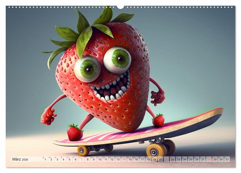 März: Eine Erdbeere auf dem Skateboard