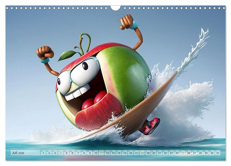 Erlebe mit dem Kalender "Fetzige Früchte" jeden Monat ein neues Abenteuer! Lustige Cartoon-Früchte haben sich in diesem Jahr auf die Piste gewagt, sind durch die Wellen gesurft und haben auch auf dem Fahrrad und im Boot ordentlich Gas gegeben. Lass dich von ihrer Abenteuerlust inspirieren und sorge für Farbe an deiner Wand - sei es im Büro oder im heimischen Wohnzimmer. Mit unseren farbenfrohen Bildern bringst du Abwechslung in dein Leben und kannst das ganze Jahr über neue fruchtige Aktivitäten entdecken.