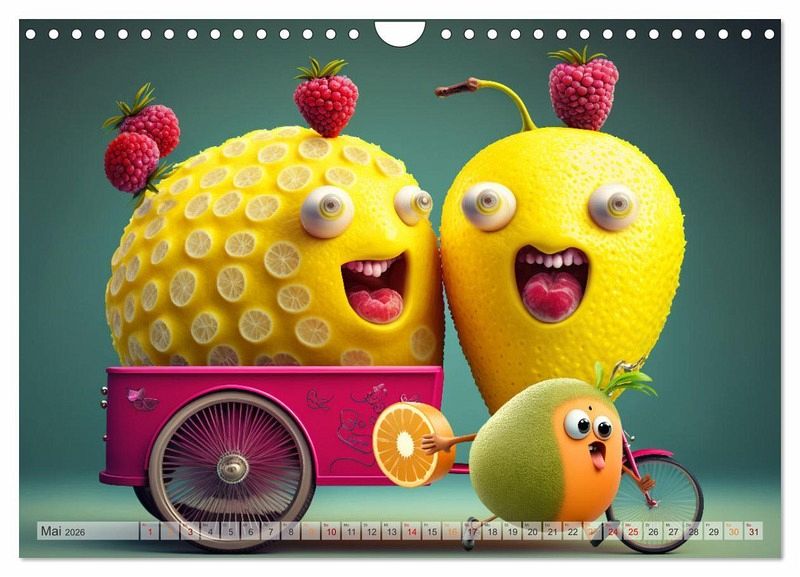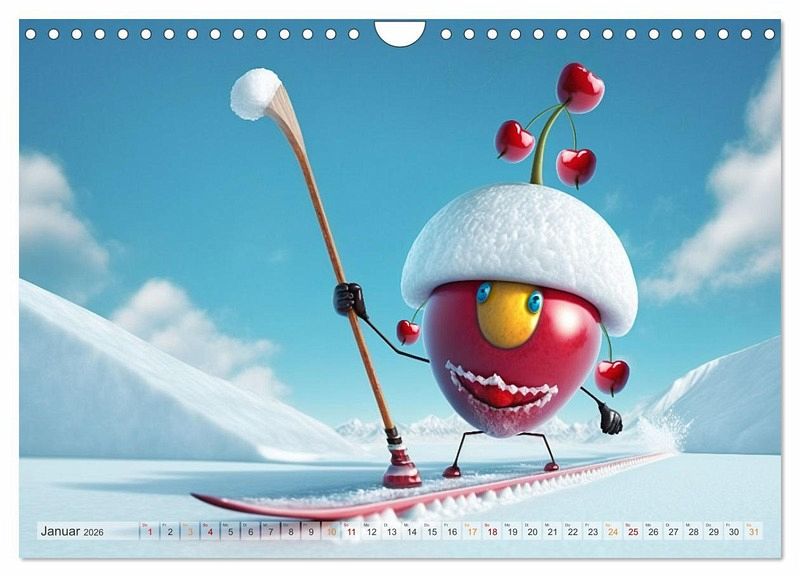 Erlebe mit dem Kalender "Fetzige Früchte" jeden Monat ein neues Abenteuer! Lustige Cartoon-Früchte haben sich in diesem Jahr auf die Piste gewagt, sind durch die Wellen gesurft und haben auch auf dem Fahrrad und im Boot ordentlich Gas gegeben. Lass dich von ihrer Abenteuerlust inspirieren und sorge für Farbe an deiner Wand - sei es im Büro oder im heimischen Wohnzimmer. Mit unseren farbenfrohen Bildern bringst du Abwechslung in dein Leben und kannst das ganze Jahr über neue fruchtige Aktivitäten entdecken.