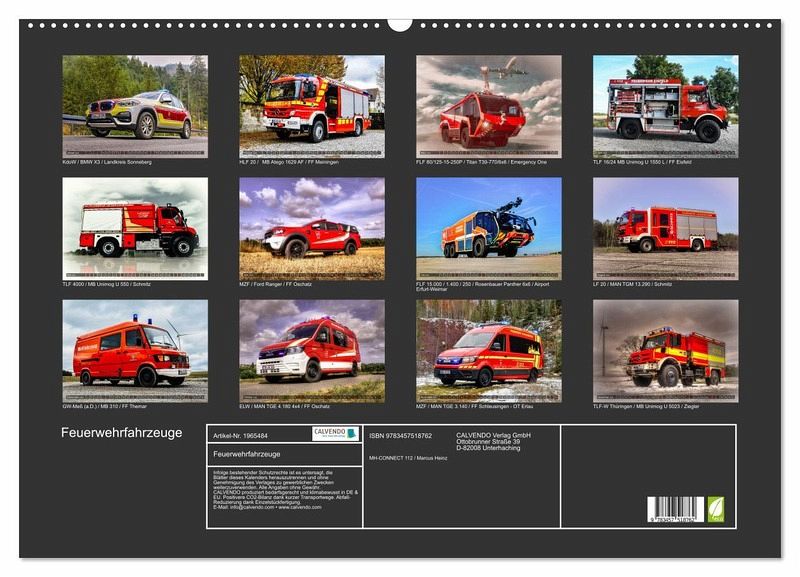 Vom Kommandowagen bis zum großen Flugfeldlöschfahrzeug zeigt der neue Kalender von MH CONNECT 112 / Marcus Heinz neue und aktuelle Einsatzfahrzeuge deutscher Feuerwehren, welche teilweise durch digitale Mehrfachbearbeitung wie Kunstwerke wirken.