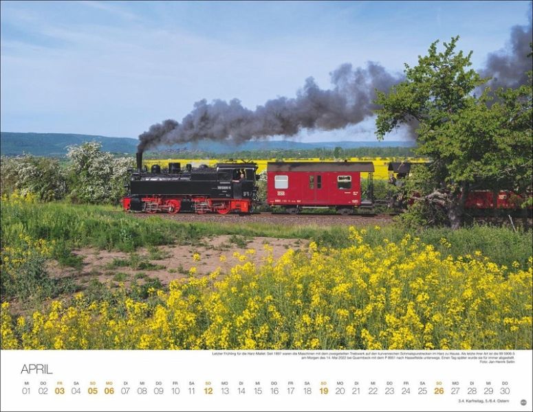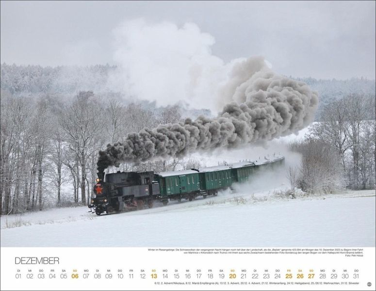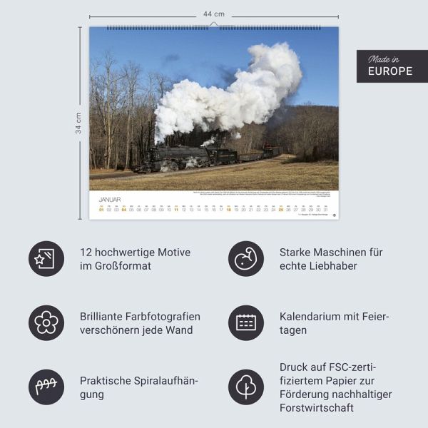 - Legendäre Dampflokomotiven und historische Züge: Kalender im Großformat - Nostalgie auf der Schiene: Dieser Zugkalender zeigt zwölf beeindruckende Loks in Aktion- Der Posterkalender im Format 44 x 34 cm lässt die Herzen von Zugenthusiast:innen höher schlagen- Die hochwertigen Dampflok-Fotos und kurze Infos zu den Bildern machen diesen Wandkalender zu einem perfekten Geschenk für Eisenbahnfans- Kalender, die zu Ihren Interessen und Hobbys passen: Bei Heye im Athesia Kalenderverlag finden Sie das Richtige!