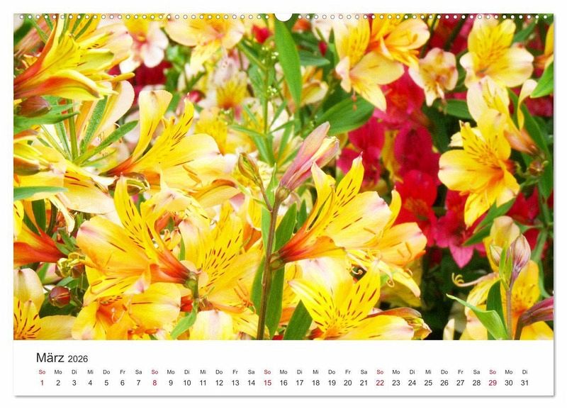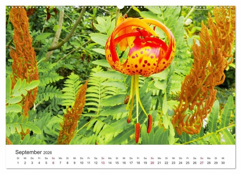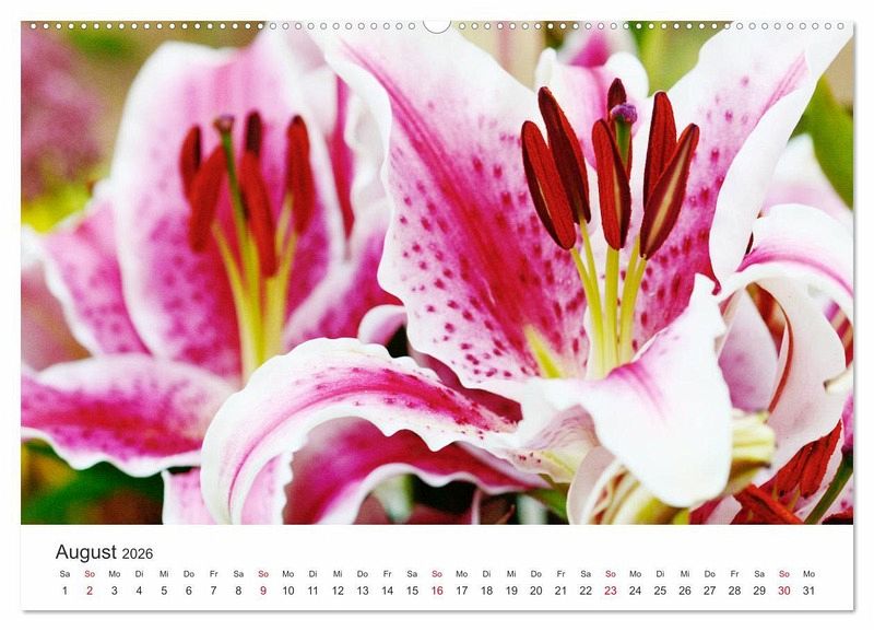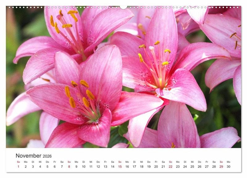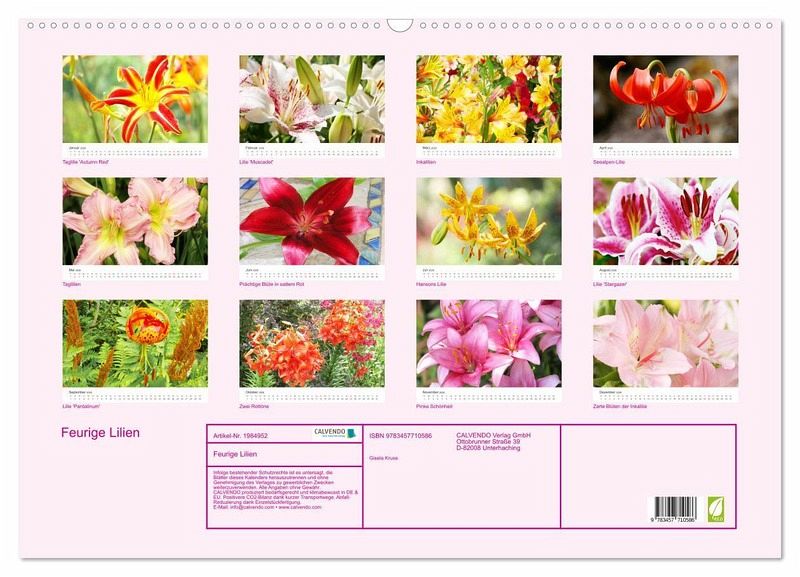 Lilien haben auffallend schöne Blüten und erfreuen sich großer Beliebtheit. Nicht nur die großblumigen Arten sind gefragt, sondern insbesondere auch die vielfältigen Taglilien oder Hemerocallis für den Garten. Und Blumensträuße werden gerne mit den zarten Blüten der Inkalilien bereichert. All die genannten Lilienarten bringt Ihnen dieser farbenfrohe Kalender in Ihre vier Wände.