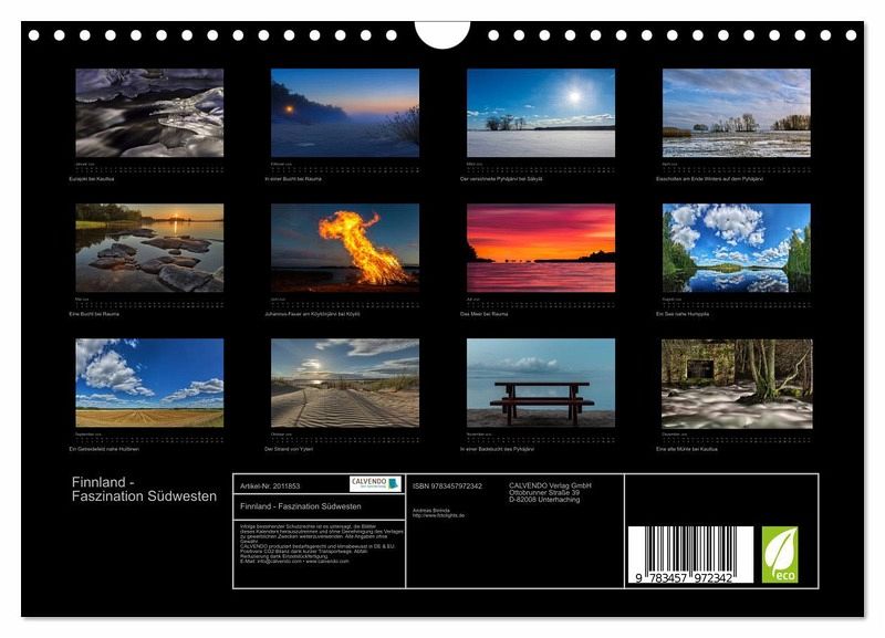 Auf 12 beeidruckenden Bildern zeigt der Kalender die Faszination des Südwesten Finnlands. Die stimmungsvollen Bilder stellen die Schönheit dieser Region zu den verschiedenen Jahres- und Tageszeiten dar.