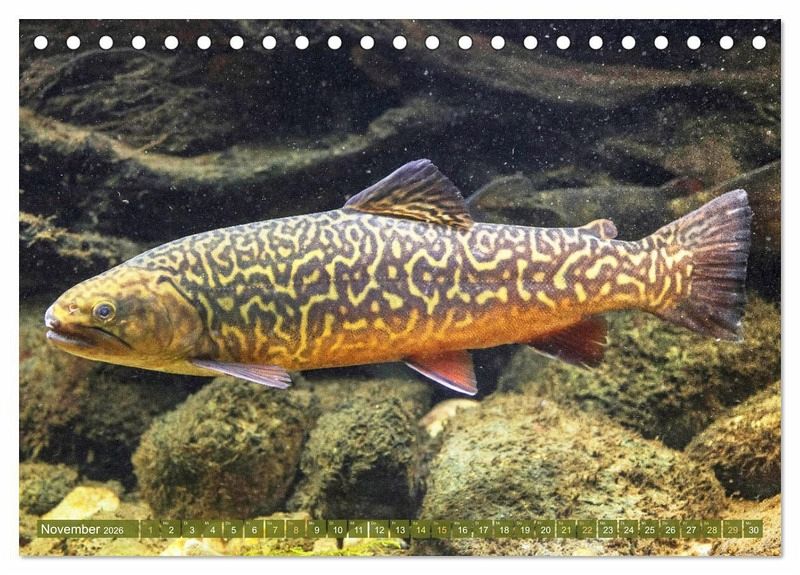 November: Tiger-Forelle (Salmo trutta fario x Salvelinus fontinalis), Kreuzung aus Bachforelle mit Bachsaibling, eignet sich für schnell fießende Gewässer