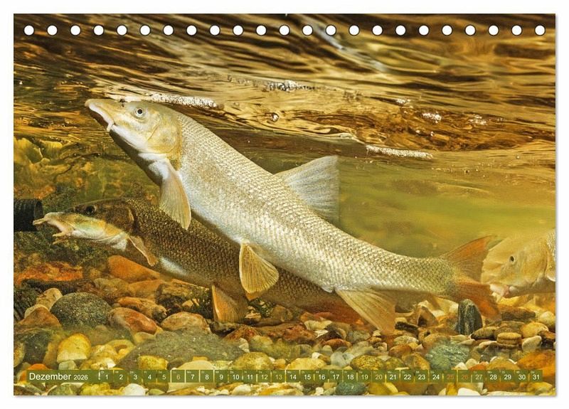 Dezember: Barbe, Flussbarbe, Barbel oder Pigge (Barbus barbus), ihr Name kommt von den Barteln am Maul, sie lebt gesellig und ist ein strömungsliebender Fisch