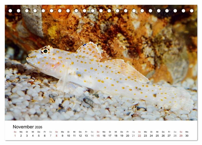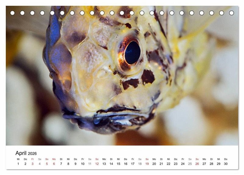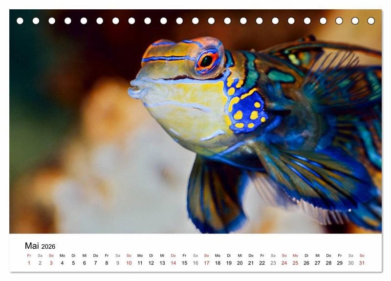 Bezaubernde Aufnahmen von Zierfischen fanden Eingang in diesen Fischkalender. Die überaus lebendig wirkenden Aufnahmen stammen aus Aquarien und zeigen den Mandarinfisch, den Anemonenfisch, den Buntbarsch und viele andere in einem weichen, stimmungsvollen Licht. Die schönen Fische zeigen Interesse an ihren Betrachtern, nehmen vielfach Blickkontakt mit ihnen auf.