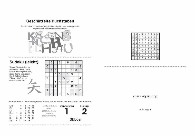 Krafttraining für die BirneZahlen- und Worträtsel, Quizfragen, Logik- und geometrische Rätsel, mathematische Aufgaben und Um-die-Ecke-DenkspieleLösungen auf der RückseiteMonatskalendarium auf jedem Blatt