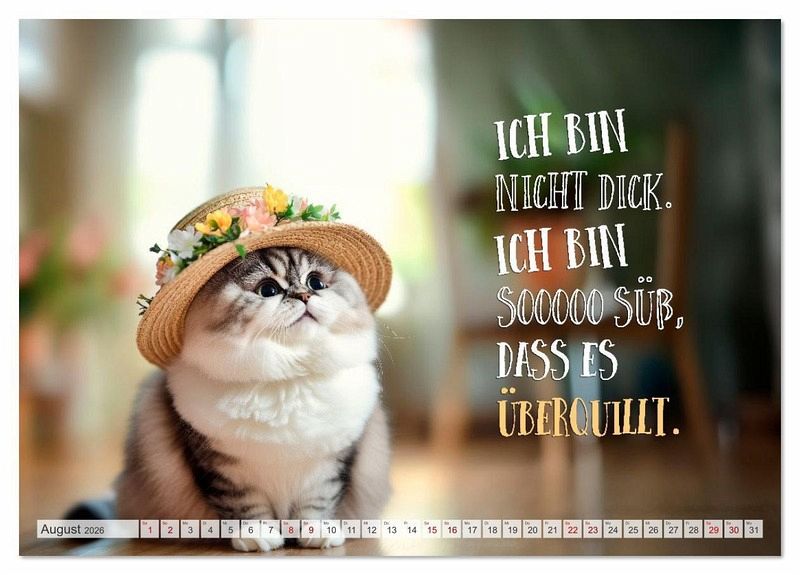 Ein Kalender für alle, die Stubentiger und gutes Essen lieben. Ob Naschkatze, Moppel-Mieze oder Sprücheklopfer, hier zeigen sich Samtpfoten von ihrer genussvollsten Seite. Mit humorvollen Bildern und frechen Texten rund ums Essen, Dickerchen-Dasein und Alltagstragödien mit Augenzwinkern ist dieser Kalender auch das perfekte Geschenk für alle, die ihre Pfunde (und Pointen) mit Humor tragen. Mit viel Liebe, einer guten Portion Lachen und KI erschaffen.