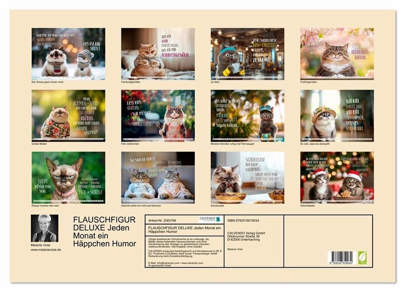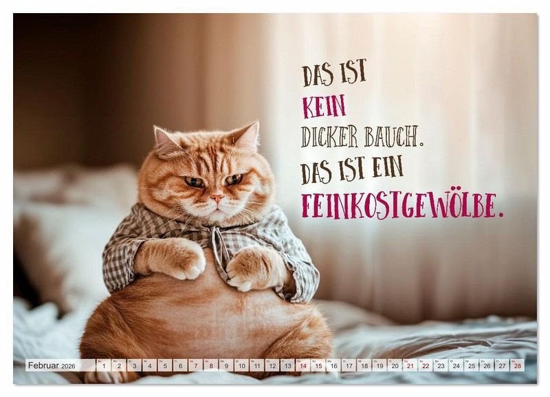 Ein Kalender für alle, die Stubentiger und gutes Essen lieben. Ob Naschkatze, Moppel-Mieze oder Sprücheklopfer, hier zeigen sich Samtpfoten von ihrer genussvollsten Seite. Mit humorvollen Bildern und frechen Texten rund ums Essen, Dickerchen-Dasein und Alltagstragödien mit Augenzwinkern ist dieser Kalender auch das perfekte Geschenk für alle, die ihre Pfunde (und Pointen) mit Humor tragen. Mit viel Liebe, einer guten Portion Lachen und KI erschaffen.