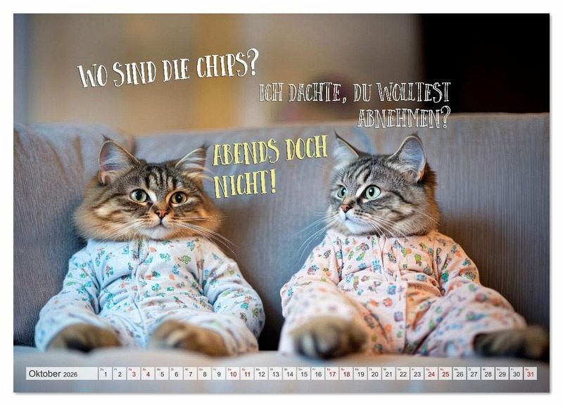 Ein Kalender für alle, die Stubentiger und gutes Essen lieben. Ob Naschkatze, Moppel-Mieze oder Sprücheklopfer, hier zeigen sich Samtpfoten von ihrer genussvollsten Seite. Mit humorvollen Bildern und frechen Texten rund ums Essen, Dickerchen-Dasein und Alltagstragödien mit Augenzwinkern ist dieser Kalender auch das perfekte Geschenk für alle, die ihre Pfunde (und Pointen) mit Humor tragen. Mit viel Liebe, einer guten Portion Lachen und KI erschaffen.