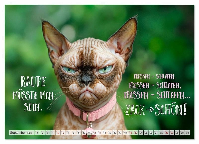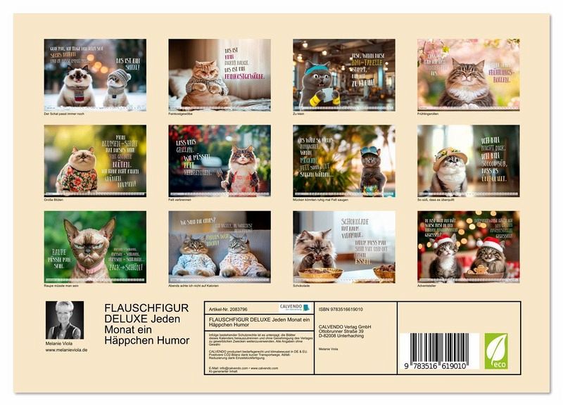 Ein Kalender für alle, die Stubentiger und gutes Essen lieben. Ob Naschkatze, Moppel-Mieze oder Sprücheklopfer, hier zeigen sich Samtpfoten von ihrer genussvollsten Seite. Mit humorvollen Bildern und frechen Texten rund ums Essen, Dickerchen-Dasein und Alltagstragödien mit Augenzwinkern ist dieser Kalender auch das perfekte Geschenk für alle, die ihre Pfunde (und Pointen) mit Humor tragen. Mit viel Liebe, einer guten Portion Lachen und KI erschaffen.