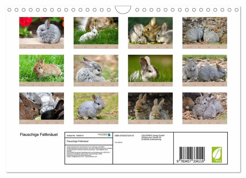 Verlieben Sie sich jeden Tag neu - mit unserem entzückenden Kaninchenbabies-Kalender! Tauchen Sie ein in die Welt flauschiger Niedlichkeit und lassen Sie sich von süßen Schnappschüssen dieser kleinen Wunder verzaubern. Jeder Monat präsentiert ein neues Bild, das Ihr Herz erwärmt und ein Lächeln auf Ihr Gesicht zaubert. Ob als Geschenk für Tierliebhaber oder als persönliche Freude, unser Kalender bringt das ganze Jahr über Freude und Wärme in Ihr Zuhause. Bestellen Sie jetzt und lassen Sie sich von der unwiderstehlichen Anziehungskraft dieser kleinen Fellknäuel begeistern!