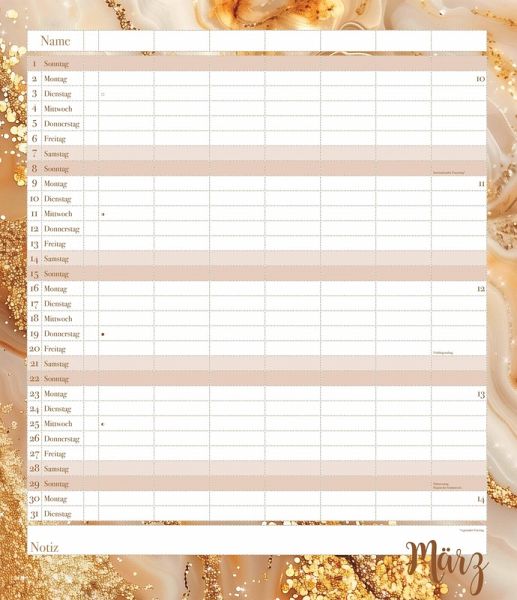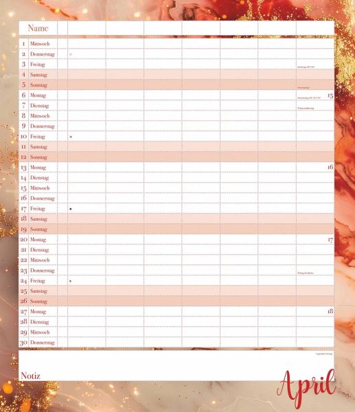 Perfekt für große Familien: 7 großzügige Spalten ideal für Familien, WGs oder zur Trennung von Arbeit, Freizeit und Hobbys Übersichtliche Monatsdarstellung: Mit Kalenderwochen, Mondphasen und klar strukturierter Aufteilung für alle wichtigen Termine Elegantes Glamour-Design: Stilvoller Look, der Organisation und dekoratives Wohnambiente harmonisch verbindet Praktische Extras: Inklusive Datumsstickern für flexible Planung Großzügiges Format: 35 x 40 cm sorgt für Übersicht und ausreichend Platz für alle Einträge