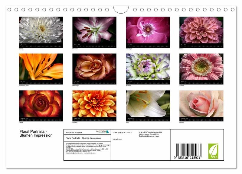 QUALITÄT - Hochwertiger Fotokalender mit 12 wunderschönen Motiven auf lichtbeständigem Bilderdruckpapier, robuste Spiralbindung mit Aufhängebügel.NACHHALTIG - deutliche Abfallreduzierung durch bedarfsgerechte Einzelstückfertigung, umweltfreundliches FSC-zertifiziertes Papier, Produktion in Deutschland, klimabewusste Logistik.PERFEKTES GESCHENK - Kalender für Freunde und Familie, für Kinder und Erwachsene, jung und alt, zu Weihnachten, Geburtstag oder zwischendurch.VIELFALT - Bildkalender in verschiedenen Formaten, z.B. DIN A5, DIN A4, DIN A3 sowie DIN A2. Ob Naturmotiv, Gemälde oder Fotos, ideal für ein persönliches Wohlfühlambiente."Floral Portraits" stellt eine leuchtende Auswahl der beliebtesten Blumen vor. von Autor(in): Veroja