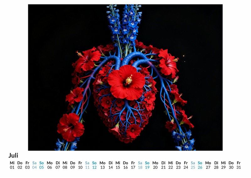 Wo die filigrane Struktur eines menschlichen Herzens aus Rosenblüten erwächst und die komplexen Windungen eines Gehirns aus Farnen und Moosen geformt werden, beginnt eine Reise in eine neue Ästhetik. Der Kalender "Florale Anatomie" verbindet zwei scheinbar gegensätzliche Welten: die präzise Wissenschaft der Anatomie und die organische Schönheit der Botanik. Dieser Kalender ist eine ausgezeichnete Wahl: * Für Liebhaber von botanischer Kunst und unkonventionellen Darstellungen. * Für Menschen mit einem Faible für medizinische Illustrationen und Natur. * Für alle, die ein besonderes Geschenk suchen, das zum Nachdenken anregt. Jeder Monat enthüllt ein neues Motiv, in dem Organe wie Lungen, Nieren oder das menschliche Auge detailreich aus einer Vielzahl von Pflanzen und Blüten komponiert sind. Die Motive entstehen nicht durch Pinsel oder Kamera, sondern entspringen einem kreativen Dialog zwischen menschlicher Vision und maschineller Interpretation. Das Ergebnis ist eine faszinierende Symbiose, die die Zerbrechlichkeit und Komplexität des Lebens aufzeigt. Was dieser Kalender bietet: * Zwölf einzigartige Monatsmotive, die Anatomie neu interpretieren. * Eine visuelle Erkundung des menschlichen Körpers durch die Sprache der Blumen. * Ein Jahresbegleiter, der Kunst und Funktion miteinander vereint. "Florale Anatomie" ist mehr als nur ein Kalender. Es ist eine monatliche Erinnerung an die poetische Verbindung zwischen dem menschlichen Körper und der Welt der Pflanzen. Entdecken Sie zwölf Perspektiven, die die Schönheit des Lebens in einer unerwarteten Form zelebrieren.