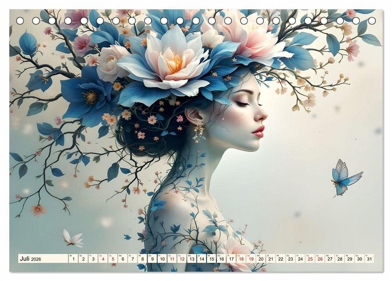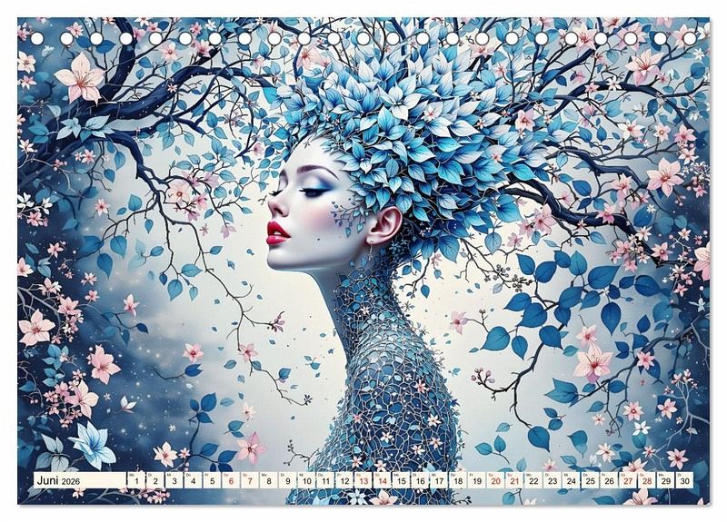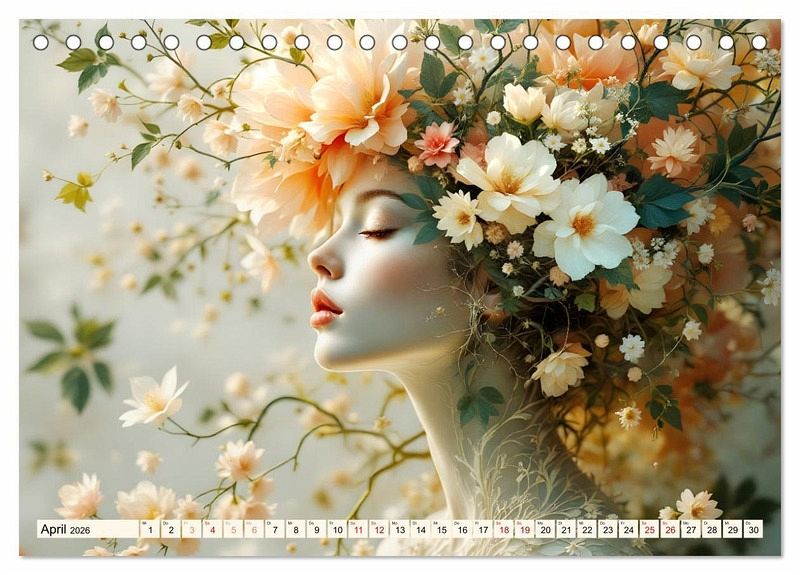 Entdecken Sie die magische Welt der Verbindung von Mensch und Natur, Welt voller Schönheit und Poesie. Jedes Monatsblatt zeigt faszinierende Bilder einer Frau, deren Haare und Körper von prächtigen Blumen und Ranken umgeben sind, als wäre sie direkt aus einem blühenden Baum hervorgegangen. Erleben Sie die perfekte Symbiose, eingefangen in atemberaubenden Kunstwerken, die mit Künstliche Intelligenz erstellt wurden. Lassen Sie sich jeden Monat aufs Neue verzaubern und inspirieren.