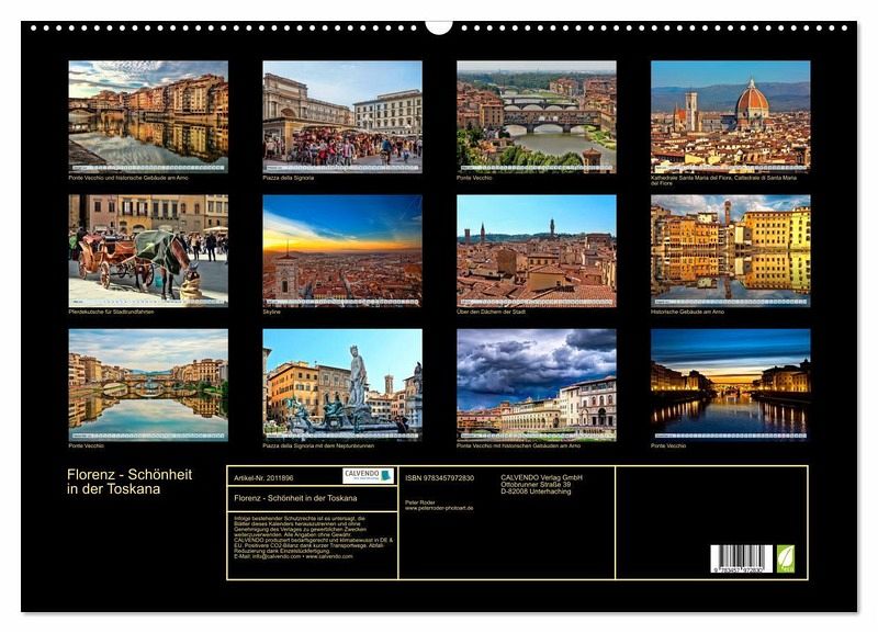 Florenz - Wiege der Renaissance und bedeutendes Zentrum von Kultur und Muße, in dem Kunstsinnige und Schaffende sich trafen und der Nachwelt ein großartiges Erbe hinterließen. Florenz - Hauptstadt der italienischen Urlaubsregion Toskana, jedes Jahr magischer Anziehungspunkt für Millionen Besucher. Florenz - modern und alt, Stadt der wunderschönen Orte und Momente, Stadt der hundert Sehenswürdigkeiten. Für diesen Kalender hat der Fotokünstler Peter Roder zwölf wunderschöne Aufnahmen dieser einzigartigen Stadt zusammengestellt und gestaltet, ein zauberhafter Hingucker für das ganze…mehr