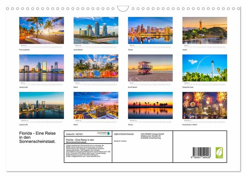 QUALITÄT - Hochwertiger Fotokalender mit 12 wunderschönen Motiven auf lichtbeständigem Bilderdruckpapier, robuste Spiralbindung mit Aufhängebügel.NACHHALTIG - deutliche Abfallreduzierung durch bedarfsgerechte Einzelstückfertigung, umweltfreundliches FSC-zertifiziertes Papier, Produktion in Deutschland, klimabewusste Logistik.PERFEKTES GESCHENK - Kalender für Freunde und Familie, für Kinder und Erwachsene, jung und alt, zu Weihnachten, Geburtstag oder zwischendurch.VIELFALT - Bildkalender in verschiedenen Formaten, z.B. DIN A5, DIN A4, DIN A3 sowie DIN A2. Ob Naturmotiv, Gemälde oder Fotos, ideal für ein persönliches Wohlfühlambiente.Entdecken Sie die eindrucksvollen Fotografien von Florida für sich. von Autor(in): Benjamin Lederer