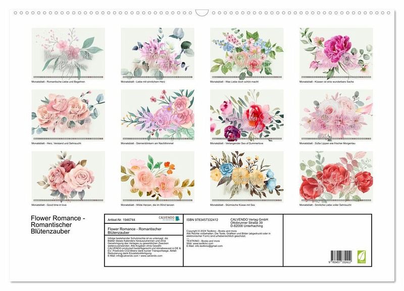 Erleben Sie das ganze Jahr über die Schönheit der Liebe mit unserem romantischen Kalender im A4 Format. Jeder Monat begeistert mit zauberhaften Blumenmotiven, die von leidenschaftlichen Rosen bis hin zu zarten Pfingstrosen reichen. Zusätzlich zu den beeindruckenden Bildern enthält jeder Monat einen inspirierenden Kalenderspruch, der Herzen berührt und zum Träumen anregt. Ob als Geschenk für geliebte Menschen oder zur Verschönerung Ihres eigenen Raumes - dieser Kalender ist ein perfekter Begleiter. Hergestellt aus hochwertigem, umweltfreundlichem Papier, bietet er sowohl Funktionalität als auch Stil. Lassen Sie sich von der Poesie der Natur verzaubern und genießen Sie die kleinen Momente der Liebe. Holen Sie sich jetzt Ihr Exemplar und lassen Sie die Romantik blühen!