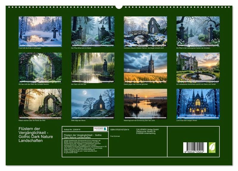 Ein Kalender für Liebhaber des Dunklen und Schönen: Flüstern der Vergänglichkeit vereint mystische Naturstimmungen mit gotischer Symbolik. Zwischen Nebel, Ruinen und Kapellen entfaltet sich eine stille Poesie aus Verfall und Licht.
