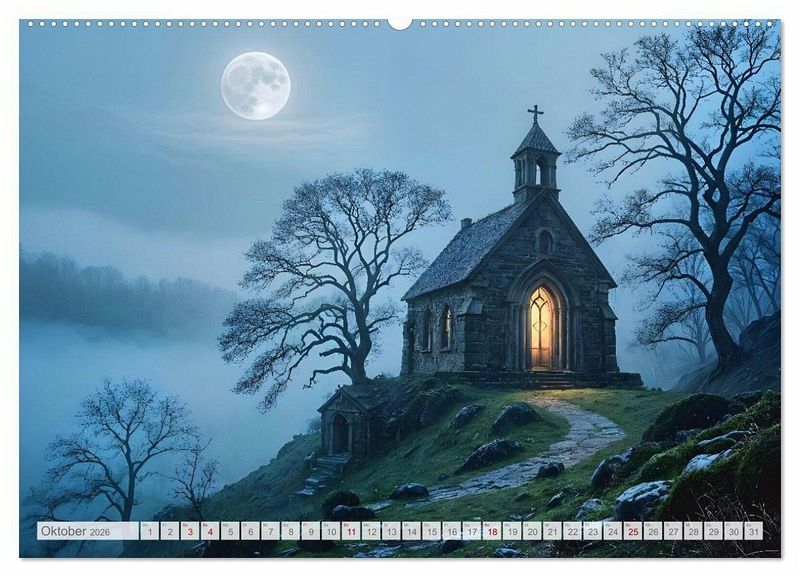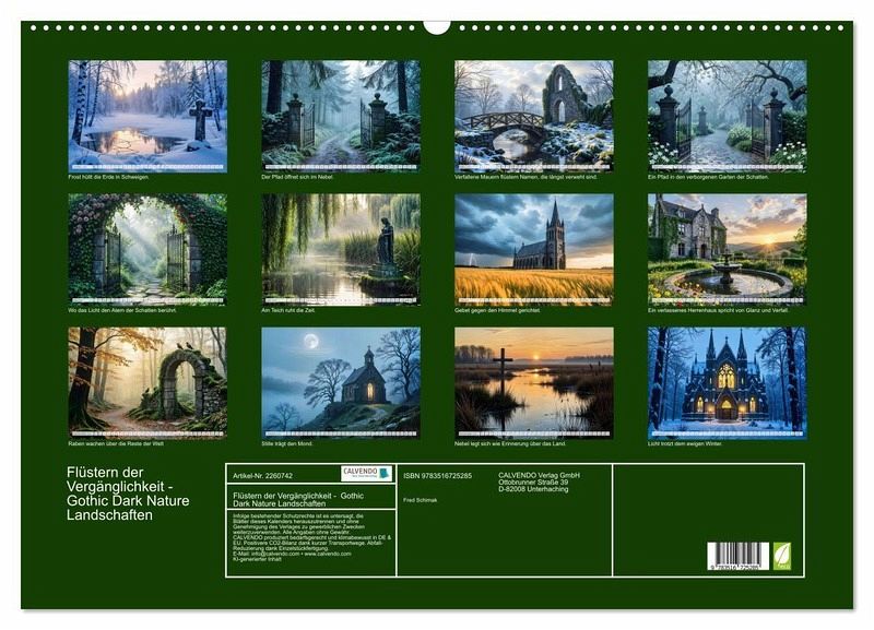 Ein Kalender für Liebhaber des Dunklen und Schönen: Flüstern der Vergänglichkeit vereint mystische Naturstimmungen mit gotischer Symbolik. Zwischen Nebel, Ruinen und Kapellen entfaltet sich eine stille Poesie aus Verfall und Licht.