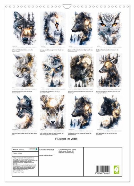 Tauche ein in eine Welt, in der Füchse flüstern, Eulen das Geheimnis der Nacht hüten und Rehe lautlos zwischen den Schleiern des Morgentaus verschwinden. Unsere heimische Tierwelt ist voller Zauber - du musst nur genau hinsehen. Magische Tierwelt unserer Heimat lädt dich ein, auf eine Reise zwischen Fantasie und Natur, zwischen Wurzeln und Wunder. Für große Träumer, kleine Entdecker - und alle, die wieder staunen wollen. Wo Natur lebendig wird. Wo Magie zuhause ist. Alle hier gezeigten Bilder wurden mit Sorgfalt, Liebe und mit Hilfe einer KI generiert. Abschließend werden sie mit Bildbearbeitungsprogrammen überarbeitet und in den Kalender eingefügt.