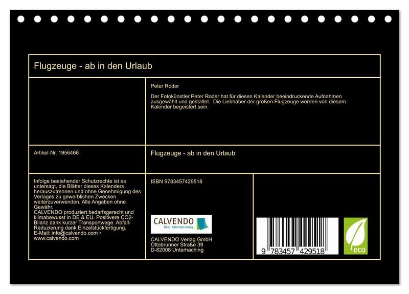 Der Fotokünstler Peter Roder hat für diesen Kalender beeindruckende Aufnahmen ausgewählt und gestaltet. Die Liebhaber der großen Flugzeuge werden von diesem Kalender begeistert sein.
