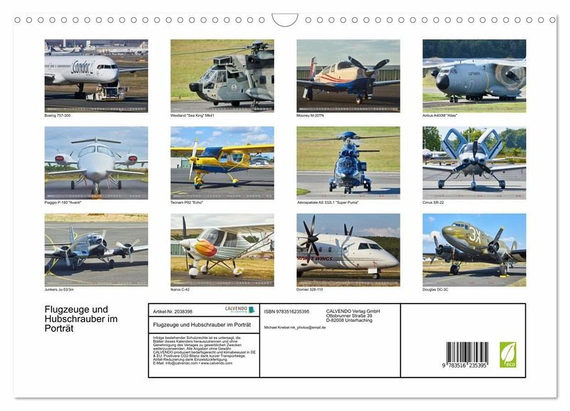 QUALITÄT - Hochwertiger Fotokalender mit 12 wunderschönen Motiven auf lichtbeständigem Bilderdruckpapier, robuste Spiralbindung mit Aufhängebügel.NACHHALTIG - deutliche Abfallreduzierung durch bedarfsgerechte Einzelstückfertigung, umweltfreundliches FSC-zertifiziertes Papier, Produktion in Deutschland, klimabewusste Logistik.PERFEKTES GESCHENK - Kalender für Freunde und Familie, für Kinder und Erwachsene, jung und alt, zu Weihnachten, Geburtstag oder zwischendurch.VIELFALT - Bildkalender in verschiedenen Formaten, z.B. DIN A5, DIN A4, DIN A3 sowie DIN A2. Ob Naturmotiv, Gemälde oder Fotos, ideal für ein persönliches Wohlfühlambiente.Porträtaufnahmen von Flugzeugen und Hubschraubern von Autor(in): Michael Knebel