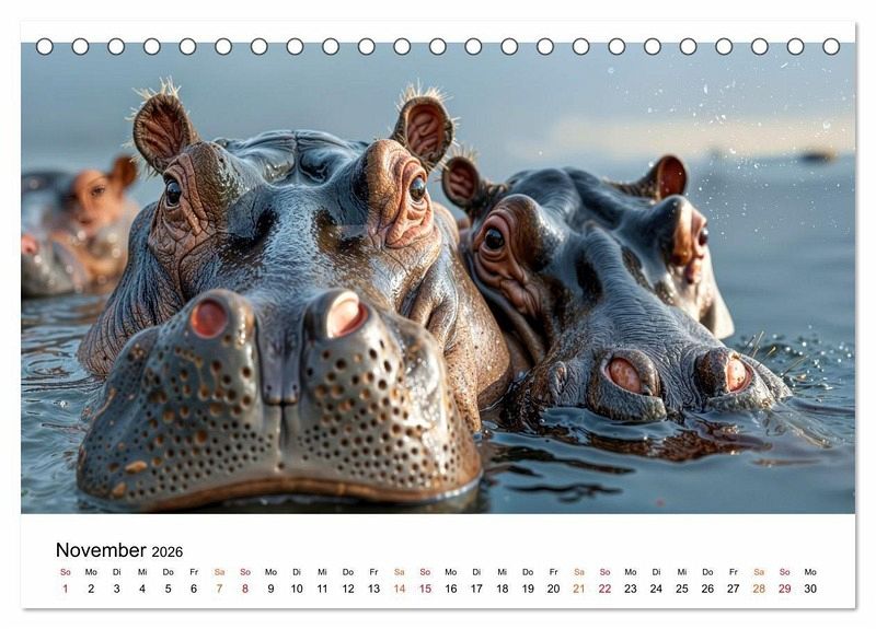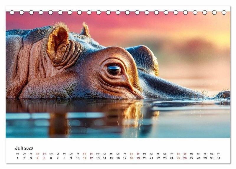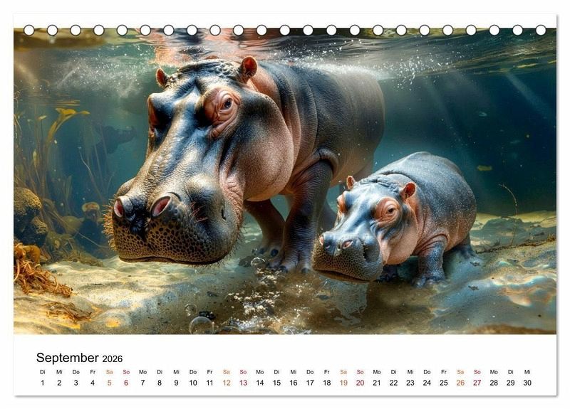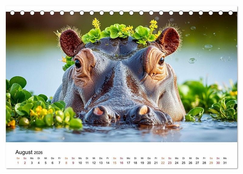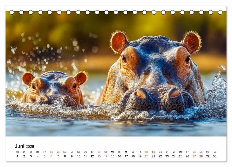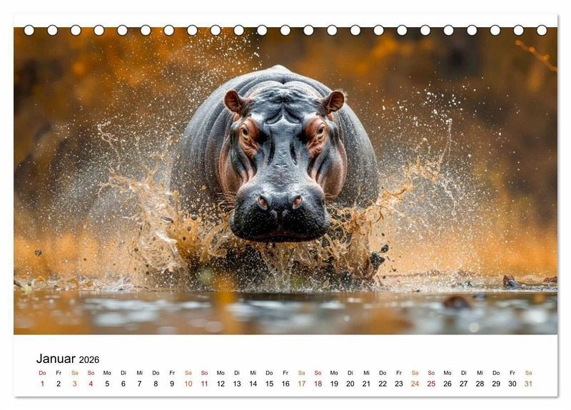 Lassen Sie sich entführen in die faszinierende Welt der Flusspferde - jener sanften Giganten, die majestätisch durch das Wasser gleiten, ihre Umgebung zum Spritzen bringen und inmitten exotischer Wasserpflanzen ein beeindruckendes Schauspiel bieten. Erleben Sie diese tonnenschweren Tiere in ihrer natürlichen Umgebung. Gestaltet mit dem Auge fürs Detail bieten diese Bilder eine ausgewogene Bildsprache, wobei die grafische Umsetzung im Zusammenspiel klassischer Gestaltung und ausgewählter KI-basierter Methoden erfolgte. Ein visuelles Erlebnis, das zum Staunen, Schmunzeln und Träumen einlädt - Monat für Monat. Ein Muss für Naturfreunde, Tierliebhaber und alle, die die Wildnis lieben.