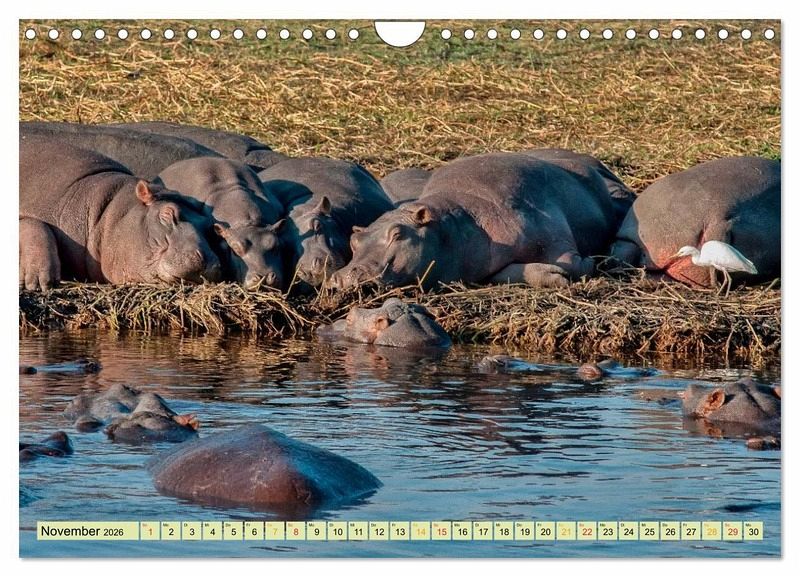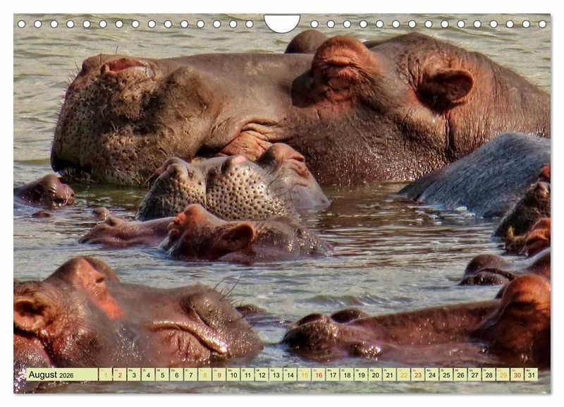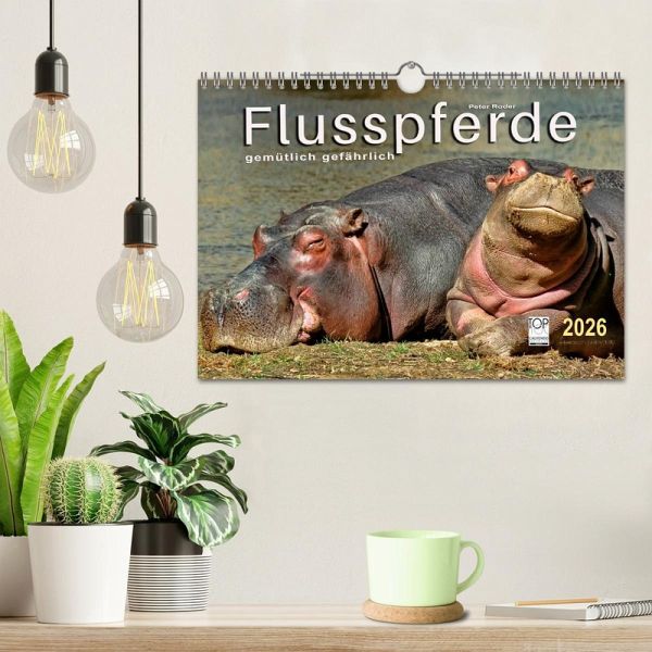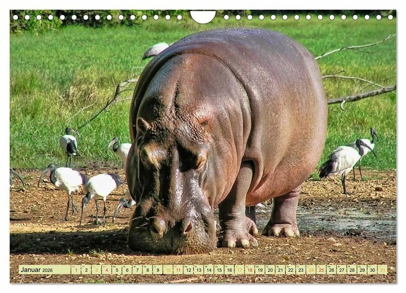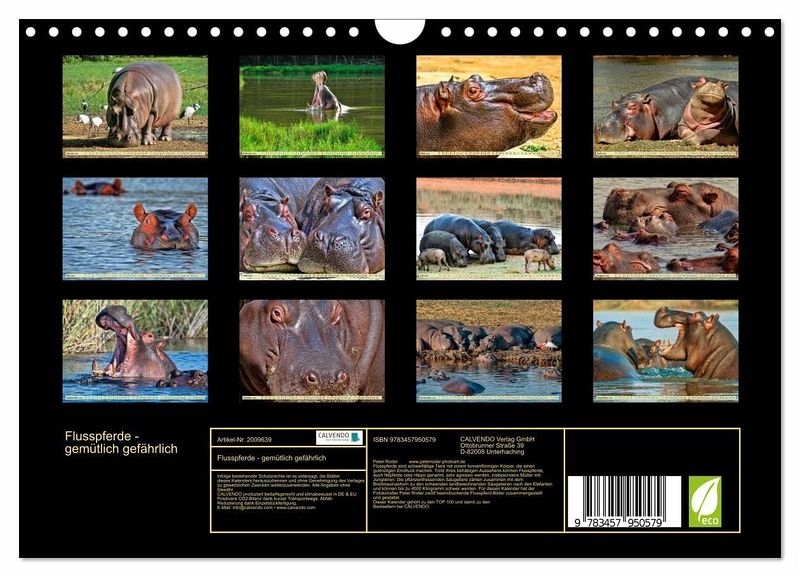 Flusspferde sind schwerfällige Tiere mit einem tonnenförmigen Körper, die einen gutmütigen Eindruck machen. Trotz ihres behäbigen Aussehens können Flusspferde, auch Nilpferde oder Hippo genannt, sehr agressiv werden, insbesondere Mütter mit Jungtieren. Die pflanzenfressenden Säugetiere zählen zusammen mit dem Breitmaulnashorn zu den schwersten landbewohnenden Säugetieren nach den Elefanten und können bis zu 4500 Kilogramm schwer werden. Für diesen Kalender hat der Fotokünstler Peter Roder zwölf beeindruckende Flusspferd-Bilder zusammengestellt und gestaltet. Ein Muss für alle Freunde dieser gewaltigen Tiere.