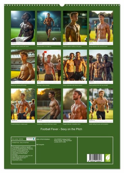PREMIUM COLLECTION - Brilliant photo calendar with 12 beautiful motifs, high-gloss art print in museum quality.QUALITY - high-quality materials, sturdy back cover with 2 innovative insert pockets for optimum presentation on the wall.SUSTAINABLE - significant reduction in waste thanks to customised one-off production, environmentally friendly FSC-certified paper, production in Germany, climate-conscious logistics.PERFECT GIFT - calendars for friends and family, for children and adults, young and old, for Christmas, birthdays or in between.Discover athletic footballers in action, showcasing their powerful bodies on the pitch. A blend of sport and sensuality for every football fan von Autor(in): Michael Bihlmayer