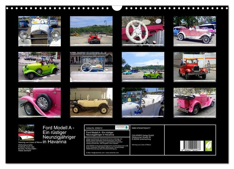 QUALITÄT - Hochwertiger Fotokalender mit 12 wunderschönen Motiven auf lichtbeständigem Bilderdruckpapier, robuste Spiralbindung mit Aufhängebügel.NACHHALTIG - deutliche Abfallreduzierung durch bedarfsgerechte Einzelstückfertigung, umweltfreundliches FSC-zertifiziertes Papier, Produktion in Deutschland, klimabewusste Logistik.PERFEKTES GESCHENK - Kalender für Freunde und Familie, für Kinder und Erwachsene, jung und alt, zu Weihnachten, Geburtstag oder zwischendurch.VIELFALT - Bildkalender in verschiedenen Formaten, z.B. DIN A5, DIN A4, DIN A3 sowie DIN A2. Ob Naturmotiv, Gemälde oder Fotos, ideal für ein persönliches Wohlfühlambiente.Der US-Oldtimer Ford Modell A unterwegs in Havanna von Autor(in): Henning von Loewis of Menar