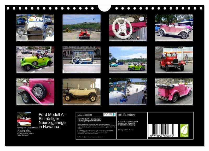 QUALITÄT - Hochwertiger Fotokalender mit 12 wunderschönen Motiven auf lichtbeständigem Bilderdruckpapier, robuste Spiralbindung mit Aufhängebügel.NACHHALTIG - deutliche Abfallreduzierung durch bedarfsgerechte Einzelstückfertigung, umweltfreundliches FSC-zertifiziertes Papier, Produktion in Deutschland, klimabewusste Logistik.PERFEKTES GESCHENK - Kalender für Freunde und Familie, für Kinder und Erwachsene, jung und alt, zu Weihnachten, Geburtstag oder zwischendurch.VIELFALT - Bildkalender in verschiedenen Formaten, z.B. DIN A5, DIN A4, DIN A3 sowie DIN A2. Ob Naturmotiv, Gemälde oder Fotos, ideal für ein persönliches Wohlfühlambiente.Der US-Oldtimer Ford Modell A unterwegs in Havanna von Autor(in): Henning von Loewis of Menar