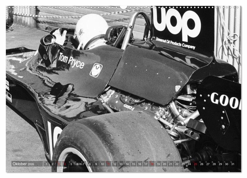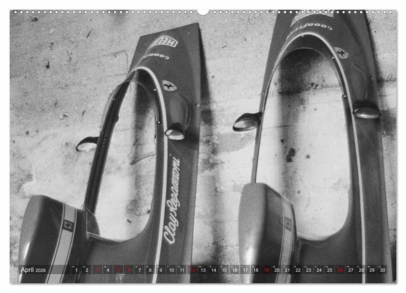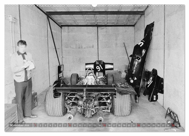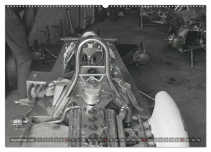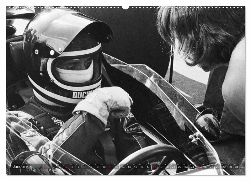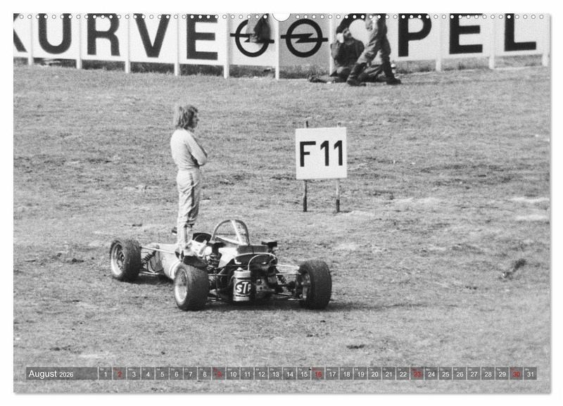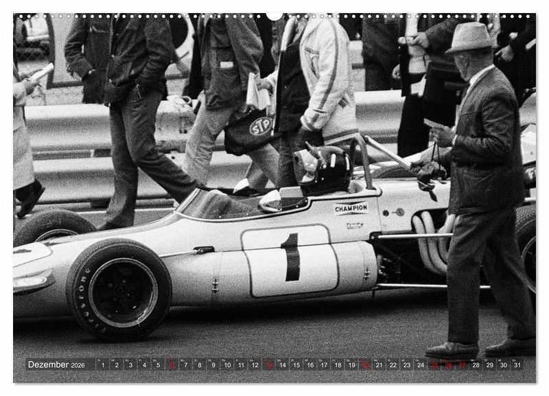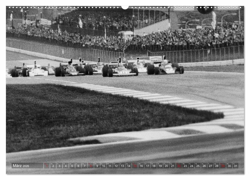 Schwarz-Weiß zeigt der Kalender Formelrennsport, die Fahrer, Monopostos und Mechaniker. Leidenschaft und Spannung liegen in der Luft. Die Aufnahmen entstanden an verschiedenen Rennstrecken und im Fahrerlager am damaligen Nürburgring.