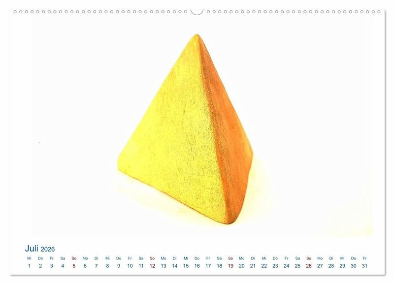 Die spannenden fünf platonischen Körper Hexaeder, Tedraeder, Oktaeder, Dodekaeder und Ikosaeder sind Motiv des Kalenders. Seit der Antike beschäftigt sich die Mathematik, die Kunst und die Philosophie mit den Polyedern. Jeder von ihnen besteht aus mehreren deckungsgleichen Vielecken und somit haben sie, egal in welcher Position, immer das gleiche Erscheinungsbild. Jeder Körper kann aus einem der anderen im Ton hergestellt werden. Indem beispielsweise beim Tetraeder die Ecken gleichzetig eingedrück werden entsteht der Oktaeder. Dies wird auch unter anderem in der Kunsttherapie genutzt.