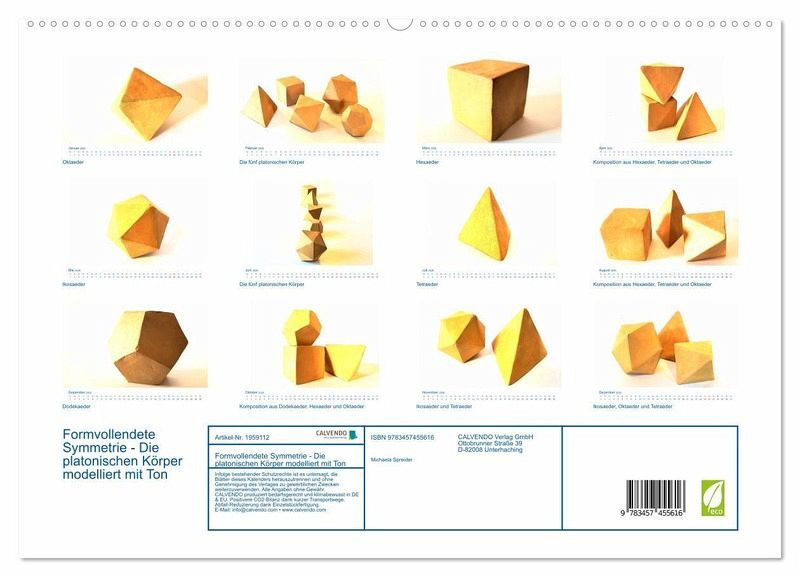 PREMIUM-LINIE - Brillanter Fotokalender mit 12 wunderschönen Motiven, Kunstdruck in Hochglanz in Museumsqualität.QUALITÄT - edle Materialien, stabile Rückwand mit 2 innovativen Einstecktaschen für eine optimale Präsentation an der Wand.NACHHALTIG - deutliche Abfallreduzierung durch bedarfsgerechte Einzelstückfertigung, umweltfreundliches FSC-zertifiziertes Papier, Produktion in Deutschland, klimabewusste Logistik.PERFEKTES GESCHENK - Kalender für Freunde und Familie, für Kinder und Erwachsene, jung und alt, zu Weihnachten, Geburtstag oder zwischendurch.Die fünf platonischen Körper mit Ton modelliert und in Szene gesetzt von Autor(in): Michaela Spreider