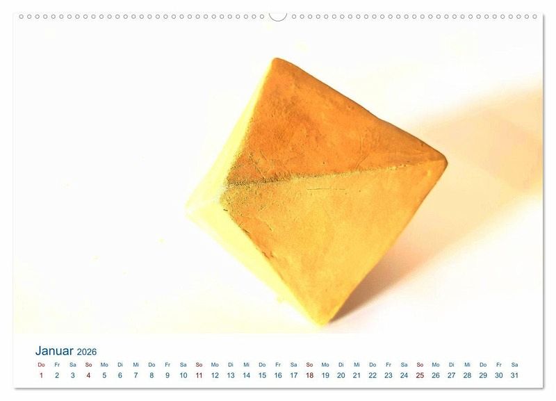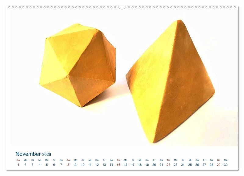 Die spannenden fünf platonischen Körper Hexaeder, Tedraeder, Oktaeder, Dodekaeder und Ikosaeder sind Motiv des Kalenders. Seit der Antike beschäftigt sich die Mathematik, die Kunst und die Philosophie mit den Polyedern. Jeder von ihnen besteht aus mehreren deckungsgleichen Vielecken und somit haben sie, egal in welcher Position, immer das gleiche Erscheinungsbild. Jeder Körper kann aus einem der anderen im Ton hergestellt werden. Indem beispielsweise beim Tetraeder die Ecken gleichzetig eingedrück werden entsteht der Oktaeder. Dies wird auch unter anderem in der Kunsttherapie genutzt.