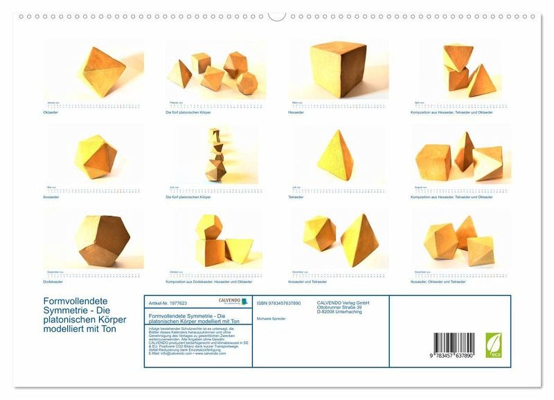 QUALITÄT - Hochwertiger Fotokalender mit 12 wunderschönen Motiven auf lichtbeständigem Bilderdruckpapier, robuste Spiralbindung mit Aufhängebügel.NACHHALTIG - deutliche Abfallreduzierung durch bedarfsgerechte Einzelstückfertigung, umweltfreundliches FSC-zertifiziertes Papier, Produktion in Deutschland, klimabewusste Logistik.PERFEKTES GESCHENK - Kalender für Freunde und Familie, für Kinder und Erwachsene, jung und alt, zu Weihnachten, Geburtstag oder zwischendurch.VIELFALT - Bildkalender in verschiedenen Formaten, z.B. DIN A5, DIN A4, DIN A3 sowie DIN A2. Ob Naturmotiv, Gemälde oder Fotos, ideal für ein persönliches Wohlfühlambiente.Die fünf platonischen Körper mit Ton modelliert und in Szene gesetzt von Autor(in): Michaela Spreider