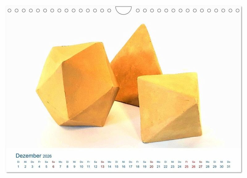 Die spannenden fünf platonischen Körper Hexaeder, Tedraeder, Oktaeder, Dodekaeder und Ikosaeder sind Motiv des Kalenders. Seit der Antike beschäftigt sich die Mathematik, die Kunst und die Philosophie mit den Polyedern. Jeder von ihnen besteht aus mehreren deckungsgleichen Vielecken und somit haben sie, egal in welcher Position, immer das gleiche Erscheinungsbild. Jeder Körper kann aus einem der anderen im Ton hergestellt werden. Indem beispielsweise beim Tetraeder die Ecken gleichzetig eingedrück werden entsteht der Oktaeder. Dies wird auch unter anderem in der Kunsttherapie genutzt.