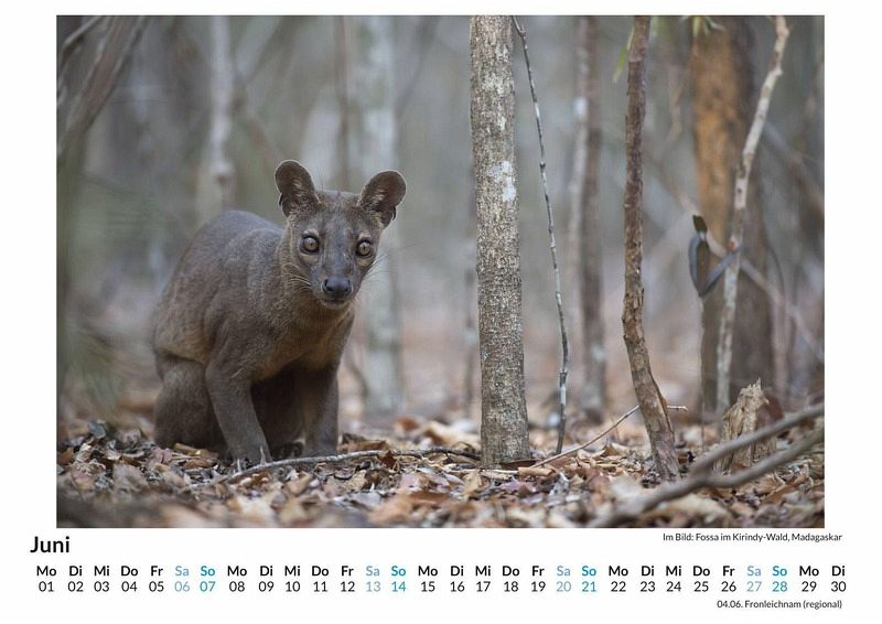 Entdecken Sie die faszinierende Welt der Fossa - der geheimnisvollen Frettkatze Madagaskars - mit unserem exklusiven Monats-Wandkalender! Tauchen Sie Monat für Monat in die Schönheit und Eleganz dieses seltenen Raubtiers ein, festgehalten in 12 atemberaubenden Motiven auf hochwertigem, lichtbeständigem Bilderdruckpapier. Jeder Kalender wird in Deutschland auf FSC-zertifiziertem Papier gedruckt, um höchste Qualität und Nachhaltigkeit zu gewährleisten. Perfekt für Tierliebhaber und Naturschützer, die sich von der Wildnis Madagaskars inspirieren lassen möchten. Holen Sie sich jetzt dieses einzigartige Kunstwerk für Ihre Wand - ein echter Hingucker für jedes Zuhause! Hochwertig Erleben Sie ein Jahr voller Eleganz mit unserem Premium-Fotokalender. Jedes der 12 Motive ist auf hochwertigem, lichtbeständigem Bilderdruckpapier gedruckt, um die Lebendigkeit jedes Bildes zu bewahren. Die robuste Spiralbindung gewährleistet Langlebigkeit und einfache Handhabung. Nachhaltig Unser Engagement für die Umwelt spiegelt sich in jedem Exemplar wider. Durch die Produktion auf Abruf reduzieren wir signifikant unseren Abfall. Wir verwenden ausschließlich umweltfreundliches, FSC-zertifiziertes Papier. Stolz gefertigt in Deutschland, achten wir bei unserer Logistik auf Klimaschutz, um unseren ökologischen Fußabdruck zu minimieren. Das ideale Geschenk Dieser Kalender ist das perfekte Präsent für jeden Anlass - ob Weihnachten, Geburtstage oder einfach als liebevolle Aufmerksamkeit zwischendurch. Geeignet für Freunde, Familie, Kinder und Erwachsene gleichermaßen, bereichert er jedes Zuhause mit seiner Vielfalt und Schönheit, unabhängig vom Alter der Beschenkten.
