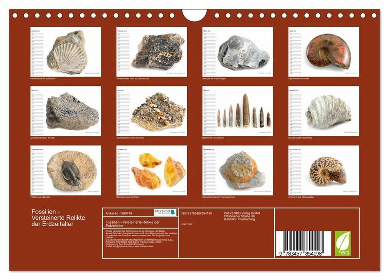Fossilien ermöglichen uns einen faszinierenden Blick in die Erdgeschichte. Bernstein und fossiles Holz sind Zeugnisse längst vergangener Urzeitwälder. Versteinerte Muscheln, Korallen und Seeigel lebten einst in Urmeeren. Der Kalender mit Planerfunktion zeigt einen Querschnitt der Vielfalt des urzeitlichen Lebens.