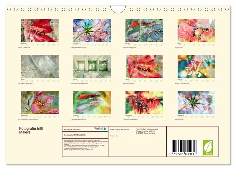 QUALITÄT - Hochwertiger Fotokalender mit 12 wunderschönen Motiven auf lichtbeständigem Bilderdruckpapier, robuste Spiralbindung mit Aufhängebügel.NACHHALTIG - deutliche Abfallreduzierung durch bedarfsgerechte Einzelstückfertigung, umweltfreundliches FSC-zertifiziertes Papier, Produktion in Deutschland, klimabewusste Logistik.PERFEKTES GESCHENK - Kalender für Freunde und Familie, für Kinder und Erwachsene, jung und alt, zu Weihnachten, Geburtstag oder zwischendurch.VIELFALT - Bildkalender in verschiedenen Formaten, z.B. DINA5, DIN A4, DIN A3 sowie DIN A2. Ob Naturmotiv, Gemälde oder Fotos, ideal für ein persönliches Wohlfühlambiente.Fotografien von Pflanzen, kleine Kunstwerke, die die Natur geschaffen hat, in Verbindung mit Malerei aufwendig gestaltet zu Unikaten. von Autor(in): Antje Trenka