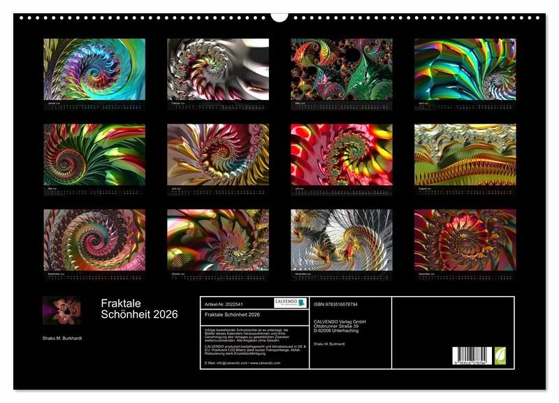 QUALITÄT - Hochwertiger Fotokalender mit 12 wunderschönen Motiven auf lichtbeständigem Bilderdruckpapier, robuste Spiralbindung mit Aufhängebügel.NACHHALTIG - deutliche Abfallreduzierung durch bedarfsgerechte Einzelstückfertigung, umweltfreundliches FSC-zertifiziertes Papier, Produktion in Deutschland, klimabewusste Logistik.PERFEKTES GESCHENK - Kalender für Freunde und Familie, für Kinder und Erwachsene, jung und alt, zu Weihnachten, Geburtstag oder zwischendurch.VIELFALT - Bildkalender in verschiedenen Formaten, z.B. DIN A5, DIN A4, DIN A3 sowie DIN A2. Ob Naturmotiv, Gemälde oder Fotos, ideal fürein persönliches Wohlfühlambiente.Lassen Sie sich bezaubern von Poesie, Formenreichtum und pulsierender Energie farbenprächtiger Schöpfungen aus dem Reich der fraktalen Geometrie! von Autor(in): Shako M. Burkhardt