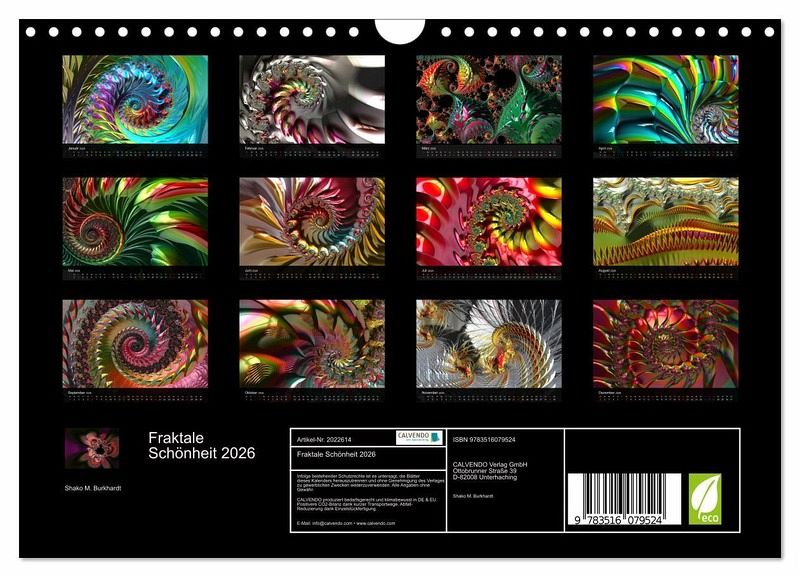 QUALITÄT - Hochwertiger Fotokalender mit 12 wunderschönen Motiven auf lichtbeständigem Bilderdruckpapier, robuste Spiralbindung mit Aufhängebügel.NACHHALTIG - deutliche Abfallreduzierung durch bedarfsgerechte Einzelstückfertigung, umweltfreundliches FSC-zertifiziertes Papier, Produktion in Deutschland, klimabewusste Logistik.PERFEKTES GESCHENK - Kalender für Freunde und Familie, für Kinder und Erwachsene, jung und alt, zu Weihnachten, Geburtstag oder zwischendurch.VIELFALT - Bildkalender in verschiedenen Formaten, z.B. DIN A5, DIN A4, DIN A3 sowie DIN A2. Ob Naturmotiv, Gemälde oder Fotos, ideal fürein persönliches Wohlfühlambiente.Lassen Sie sich bezaubern von Poesie, Formenreichtum und pulsierender Energie farbenprächtiger Schöpfungen aus dem Reich der fraktalen Geometrie! von Autor(in): Shako M. Burkhardt