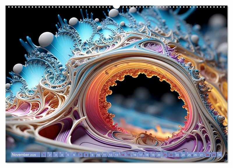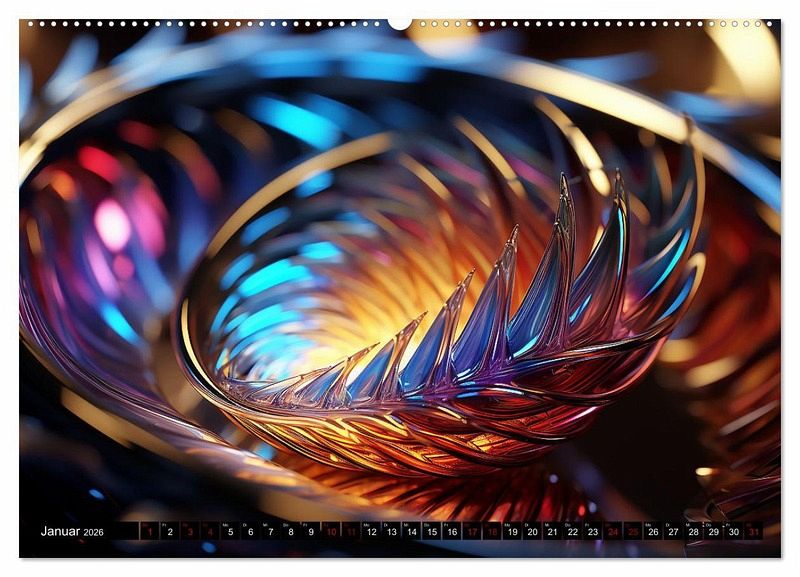 Die Berechnung von Fraktalen war vermutlich eins der Dinge, die Programmierer als erstes von Computern verlangt haben, nachdem sie Grafiken darstellen konnten. Weil sie einfach schön sind. Mit KI ist es möglich, die klassischen Fraktale mit neuen Formen kombinieren zu lassen und heraus kommt Ästhetik und Schönheit in Farbe und Form. Dieser Kalender vereint zwölf Bilder unterschiedlicher Kombinationen, die vielleicht nicht originalgetreu den Julia und Mandelbrot Fraktalen entsprechen, aber dafür die Schönheit zeigen, die in trockener Mathematik verborgen ist.